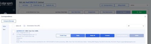 The Correspondence window displays all emails linked to the Job. You can reply to an email, reply all to an email, or forward an email from the Inbox tab. The Sent tab will display all emails sent from the DMS.